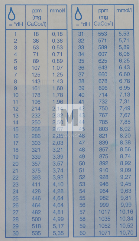 | 1 °dH = 1,7 °F | 1 °F = 0,56 °dH |