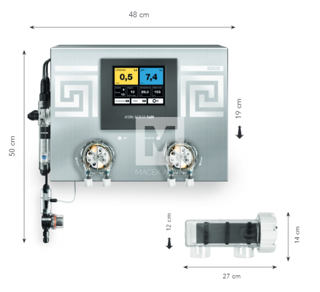 ASIN AQUA Salt is a top-of-the-line control system for saltwater in swimming pools and hot tubs with a volume up to 90 m3 for covered pools and 60 m3 for uncovered pools. It is thus suitable even for larger or extremely demanding pools. Sea salt dissolved in water at a concentration of 3 – 4 kg per 1 m3 is decomposed by an electrochemical system under the formation of chlorine, which in pool water completely kills bacteria, viruses and algae.
