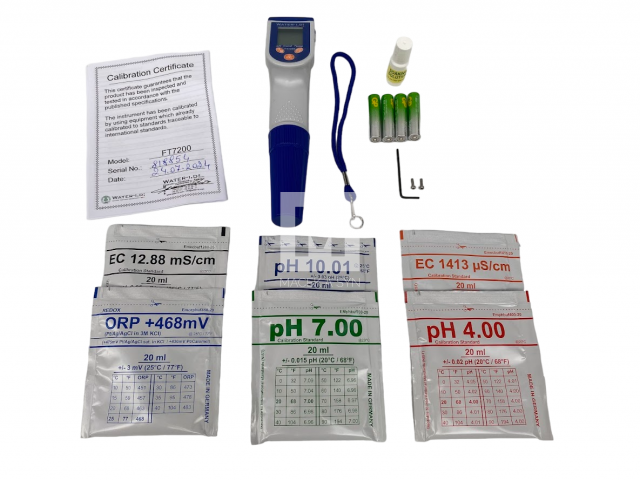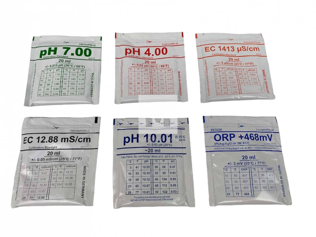 • 1 x 20 ml calibration solution pH 7.00, 1 x 20 ml calibration solution pH 4.00, 1 x 20 ml calibration solution pH 10.00, 1 x 20 ml calibration solution ORP +468mV, 1 x 20 ml calibration solution EC 1413 µS / cm, 1 x 20 ml calibration solution 12.88 mS / cm
