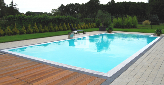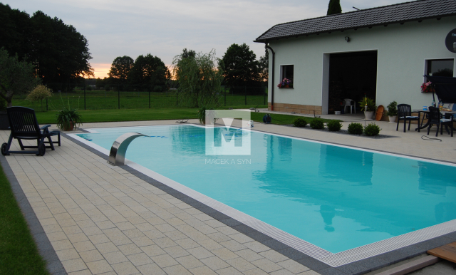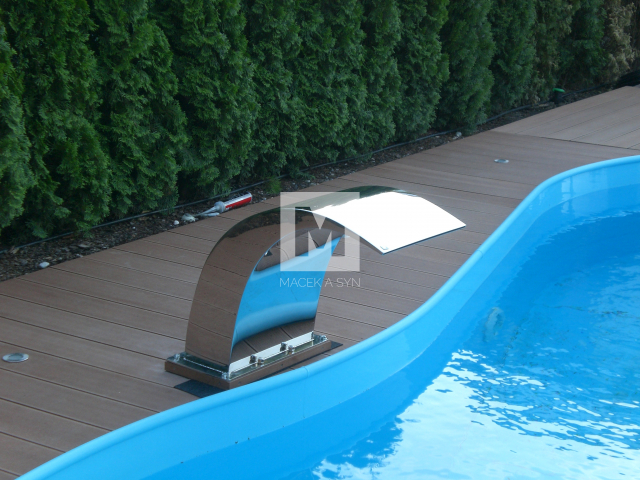 It is a pool accessory - a water jet, a popular water attraction that creates an impressive waterfall. Jets are installed at the edge of the pool and connected by a dedicated circulation loop, which consists of the pool suction, piping, and a circulation pool pump (pump power must be selected depending on the jet opening size, piping length and bends, and the expected water flow rate).