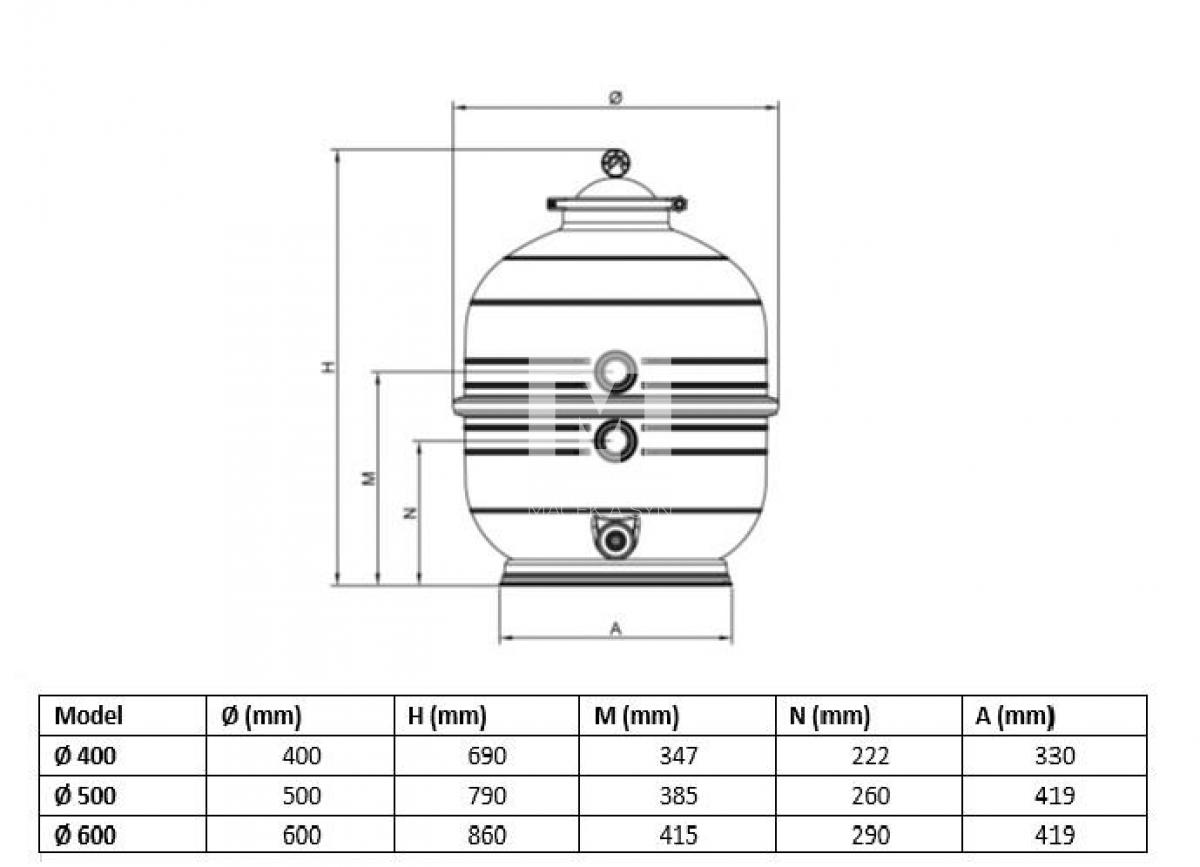The MIDI sand filtration kit can be assembled into filter kits. It is standardly supplied in a set with a 6-way side valve with a pressure gauge.