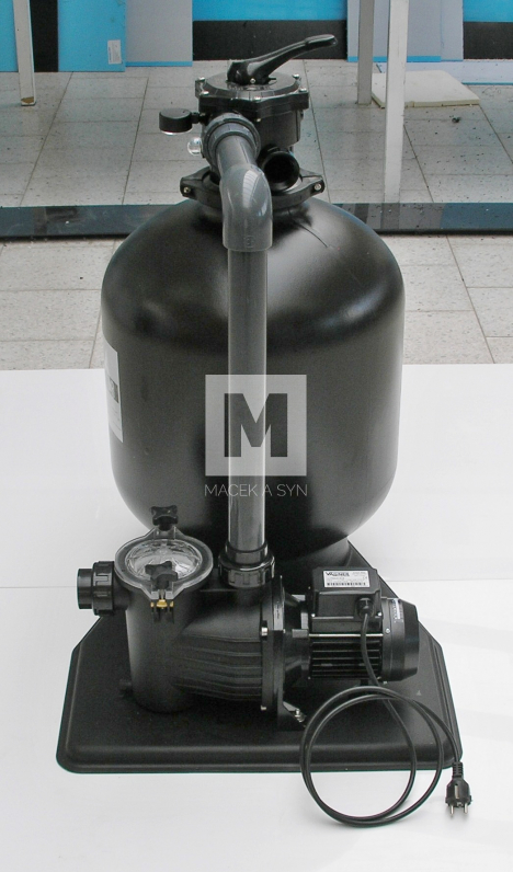 The pump is single-phase and self-priming. Maximum pressure 1.5 bar Working pressure 0.5–0.7 bar. Sand filters operate on the natural principle of water filtration. Water passes through the layered sand, which traps fine impurities. In this way the sand becomes fouled and must be backwashed, for which a six-way valve is used. Turning the valve to the backwash position changes the water flow direction and flushes the settled impurities to waste. This process can be repeated throughout the life of the sand, which is very long compared with other filtration methods. Sand filtration can be used for saltwater.