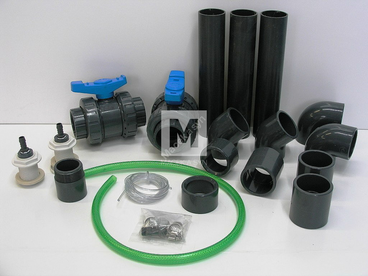 - fittings for connections (2x 63mm ball valves, 2x 63/90°, 2x 63/45°, adapters and piping).