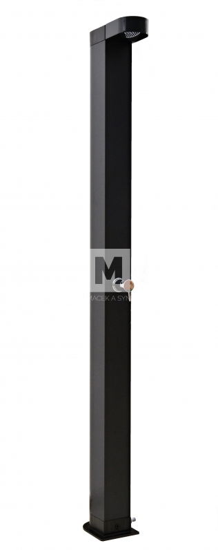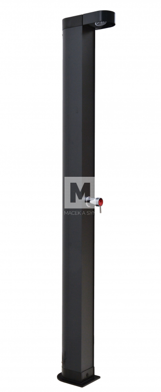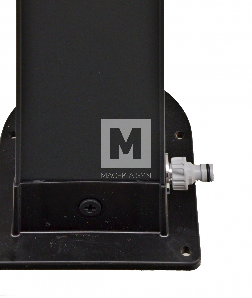 Made of aluminum with a gray finish, cold water supply to an aluminum storage tank with a capacity of 30 liters. In the tank, water is heated by solar energy. The lever faucet allows setting the desired temperature. The spray head features anti-limescale treatment, water connection with a quick-connect, mounting of the shower with screws and wall plugs (included).