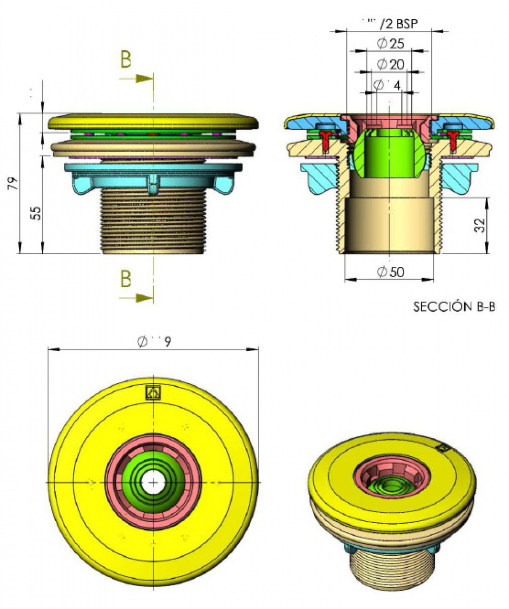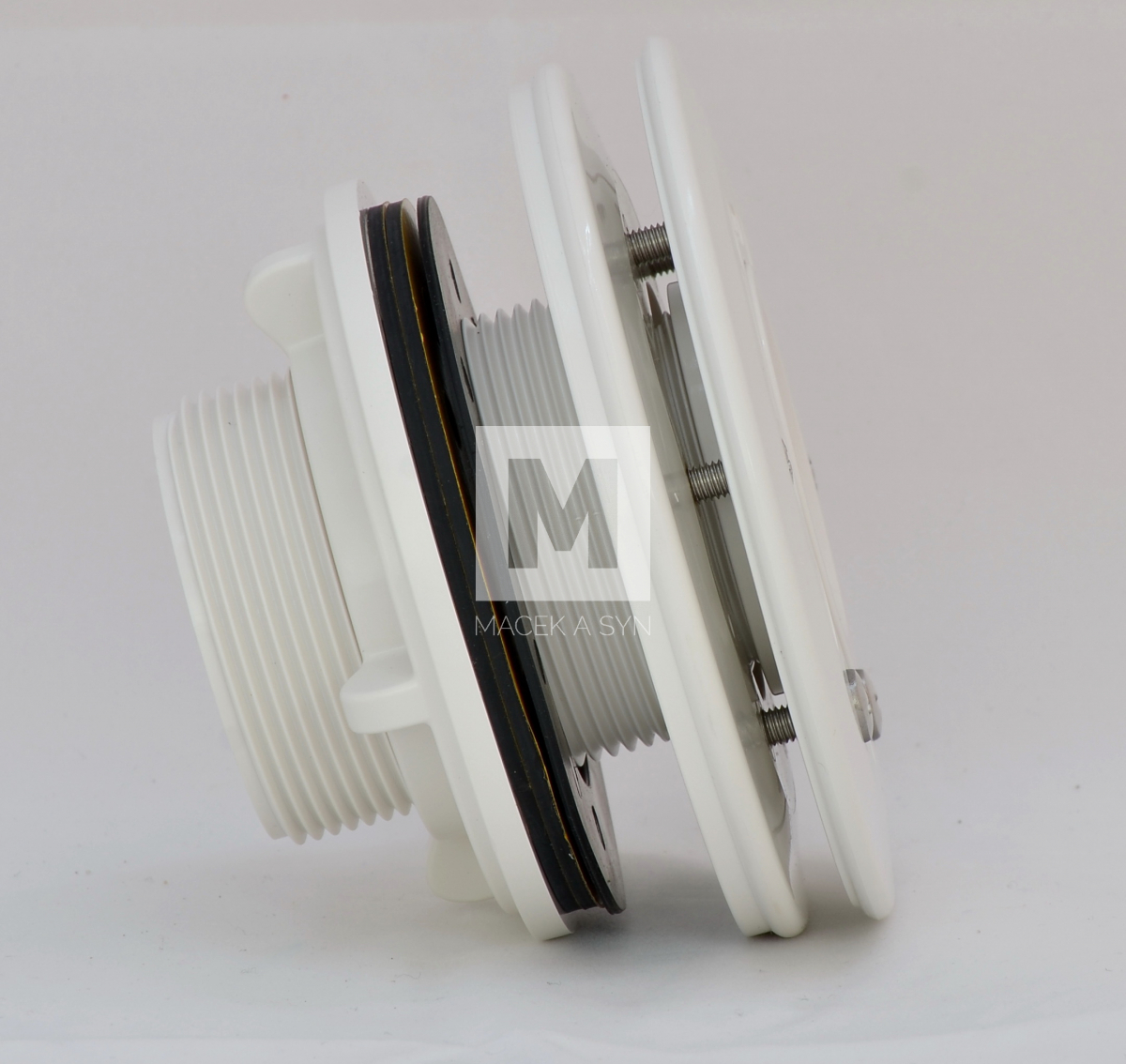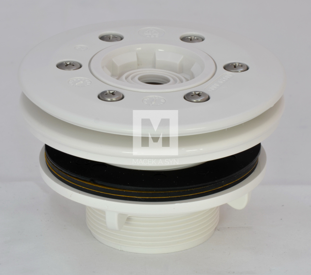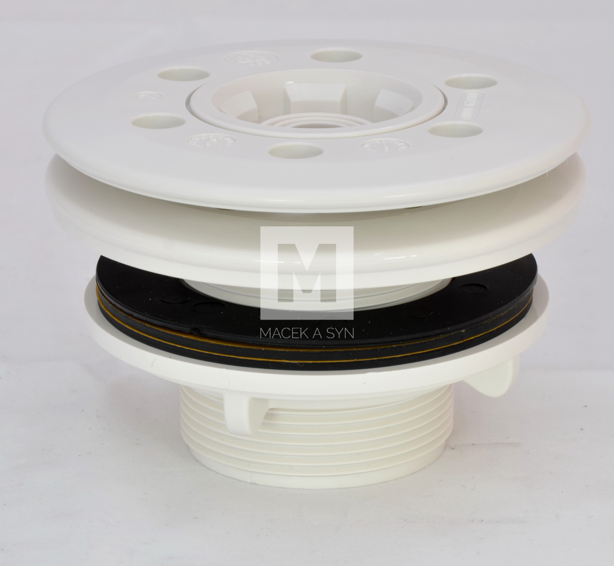 VA jet with brass spray deflectors is designed for vinyl-lined pools. It is equipped with an inlet jet with a swiveling ball, which we can direct the water flow to better remove dirt from the pool surface into the skimmer. The ABS material from which the jets are made does not change under exposure to chemical or atmospheric effects. The retaining nut with a seal is always included with the jet.